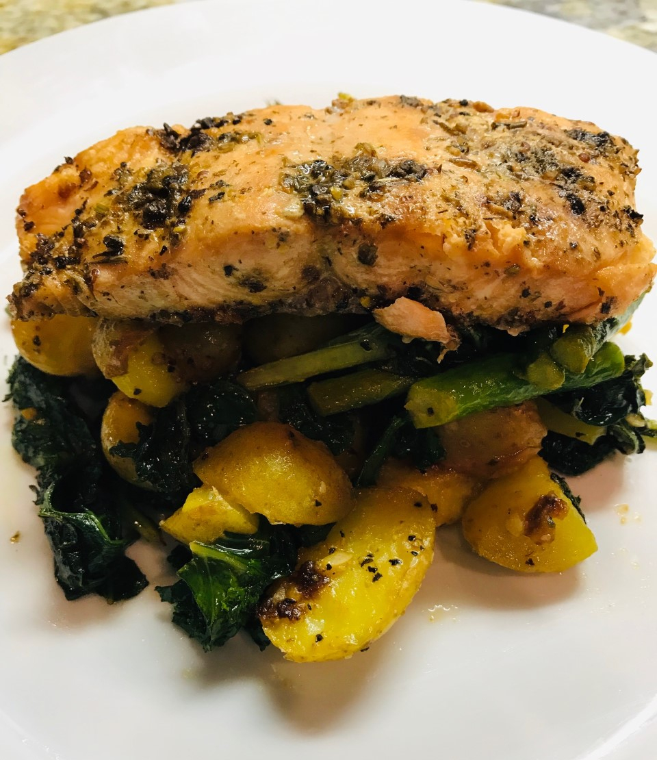 Stir until all the veggies seem cooked then season with salt and pepper to taste. Imagine all the endless variations… I topped mine with some salmon left over from Sunday night’s dinner.