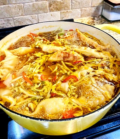 - Combine the broth, slaw mix, soy sauce, ginger, scallion whites, garlic and red pepper slices in a large saucepan, then bring to a simmer. Add the dumplings and return to a simmer. Simmer until the veggies are tender and the dumplings are cooked, about 10 minutes. Garnish with the scallion greens.